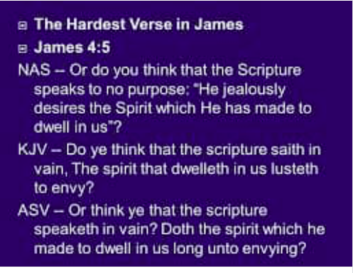 These are some things to consider and they will greatly affect the way you understand the book of James, but for now, let's get back to looking at how various bible versions have translated James 4:5 and what it really means.