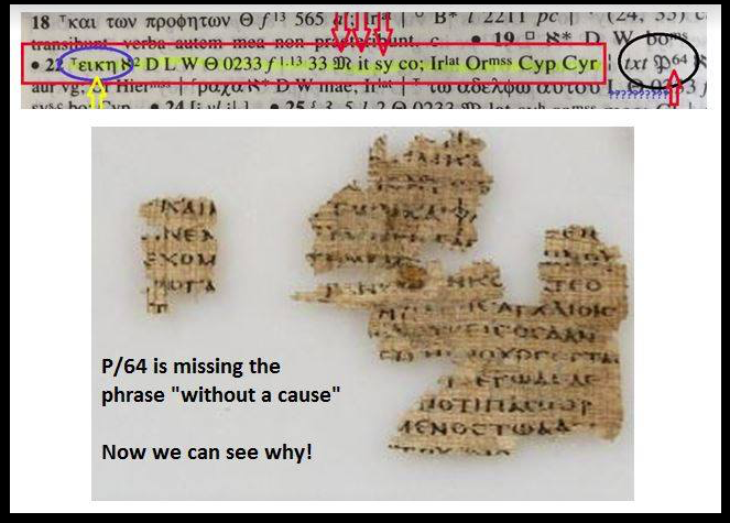 And what exactly does a scholar like Dan Wallace consider to be “the best Alexandrian witness” that differs not only from the vast Majority of all Greek manuscripts, ancient versions and church fathers, but that also “makes good practical sense in this context” and “must surely be a true interpretation of Jesus’ meaning”? Well, basically it’s ONE Greek manuscript - Vaticanus! - well known for its numerous corruptions.