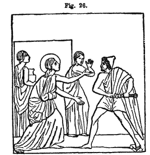 'Say, who art thou,'" &c.--COWPER'S Odyssey"This picture," adds the author of Pompeii, "is remarkable, as teaching us the origin of that ugly and unmeaning glory by which the heads of saints are often surrounded...This glory was called nimbus, or aureola, and is defined by Servius to be 'the luminous fluid which encircles the heads of the gods.' It belongs with peculiar propriety to Circe, as the daughter of the Sun. The emperors, with their usual modesty, assumed it as the mark of their divinity; and under this respectable patronage it passed, like many other Pagan superstitions and customs, into the use of the Church." The emperors here get rather more than a fair share of the blame due to them. It was not the emperors that brought "Pagan superstition" into the Church, so much as the Bishop of Rome. See Chapter VII, Section II.