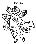 Therefore, the fruit of the Egyptian Persea was peculiarly sacred to him, from its resemblance to the "HUMAN HEART." Hence this infant divinity was frequently represented with a heart, or the heart-shaped fruit of the Persea, in one of his hands. The following extract, from John Bell's criticism on the antiques in the Picture Gallery of Florence, will show that the boyish divinity had been represented elsewhere also in ancient times in the same manner. Speaking of a statue of Cupid, he says it is "a fair, full, fleshy, round boy, in fine and sportive action, tossing back a heart." Thus the boy-god came to be regarded as the "god of the heart," in other words, as Cupid, or the god of love. To identify this infant divinity, with his father "the mighty hunter," he was equipped with "bow and arrows"; and in the hands of the poets, for the amusement of the profane vulgar, this sportive boy-god was celebrated as taking aim with his gold-tipped shafts at the hearts of mankind. His real character, however, as the above statement shows, and as we have seen reason already to conclude, was far higher and of a very different kind. He was the woman's seed. Venus and her son Cupid, then, were none other than the Madonna and the child. Looking at the subject in this light, the real force and meaning of the language will appear, which Virgil puts into the mouth of Venus, when addressing the youthful Cupid:--