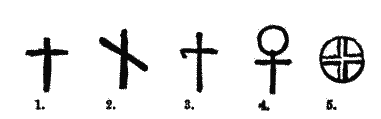 Now, this Pagan symbol seems first to have crept into the Christian Church in Egypt, and generally into Africa. A statement of Tertullian, about the middle of the third century, shows how much, by that time, the Church of Carthage was infected with the old leaven. Egypt especially, which was never thoroughly evangelised, appears to have taken the lead in bringing in this Pagan symbol. The first form of that which is called the Christian Cross, found on Christian monuments there, is the unequivocal Pagan Tau, or Egyptian "Sign of life." Let the reader peruse the following statement of Sir G. Wilkinson: "A still more curious fact may be mentioned respecting this hieroglyphical character [the Tau], that the early Christians of Egypt adopted it in lieu of the cross, which was afterwards substituted for it, prefixing it to inscriptions in the same manner as the cross in later times. For, though Dr. Young had some scruples in believing the statement of Sir A. Edmonstone, that it holds that position in the sepulchres of the great Oasis, I can attest that such is the case, and that numerous inscriptions, headed by the Tau, are preserved to the present day on early Christian monuments." The drift of this statement is evidently this, that in Egypt the earliest form of that which has since been called the cross, was no other than the "Crux Ansata," or "Sign of life," borne by Osiris and all the Egyptian gods; that the ansa or "handle" was afterwards dispensed with, and that it became the simple Tau, or ordinary cross, as it appears at this day, and that the design of its first employment on the sepulchres, therefore, could have no reference to the crucifixion of the Nazarene, but was simply the result of the attachment to old and long-cherished Pagan symbols, which is always strong in those who, with the adoption of the Christian name and profession, are still, to a large extent, Pagan in heart and feeling. This, and this only, is the origin of the worship of the "cross."