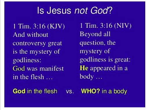 Furthermore even the modern (Trinitarian) Bible Translations disagree with the KJV and few other translations for putting the word "God" in 1 Timothy 3: 16. Let's now show what the other Bible Translations put for 1 Timothy 3:16." (End of Muslim quotes)