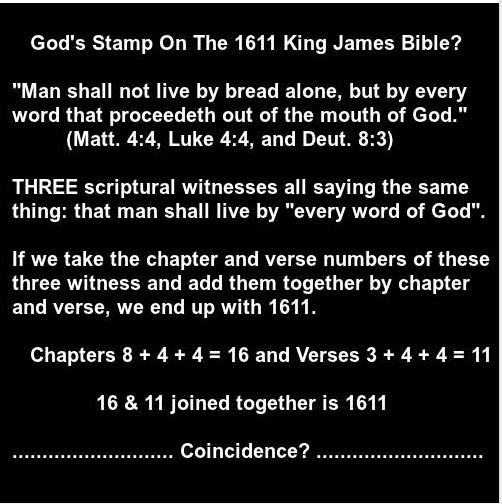 Luke 4:4 - "And Jesus answered him, saying, It is written, That man shall not live by bread alone, BUT BY EVERY WORD OF GOD." But the Vatican Versions like the ESV, NIV, NASB, NET, Holman OMIT the words "BUT BY EVERY WORD OF GOD." from Luke 4:4, though they are included in Deuteronomy 8:3 and Matthew 4:4. In these versions Luke 4:4 reads: "It is written, "Man shall not live by bread alone." (ESV, NIV, NASB, NET, Holman, Jehovah Witness NWT and Catholic versions like The Jerusalem bible 1968, St. Joseph NAB 1970 and the New Jerusalem bible 1985) So in the King James Bible we have a total of THREE witnesses all saying the same thing about how man shall live by "every word of God that proceedeth out of the mouth of God." Deuteronomy 8:3; Matthew 4:4 and Luke 4:4. If we take the chapter and verse numbers of these three witness and add them together by chapter and verse, we end up with 1611. Chapters 8 + 4 + 4 = 16 and Verses 3 + 4 + 4 = 11, thus 1611. Just another "coincidence", right?