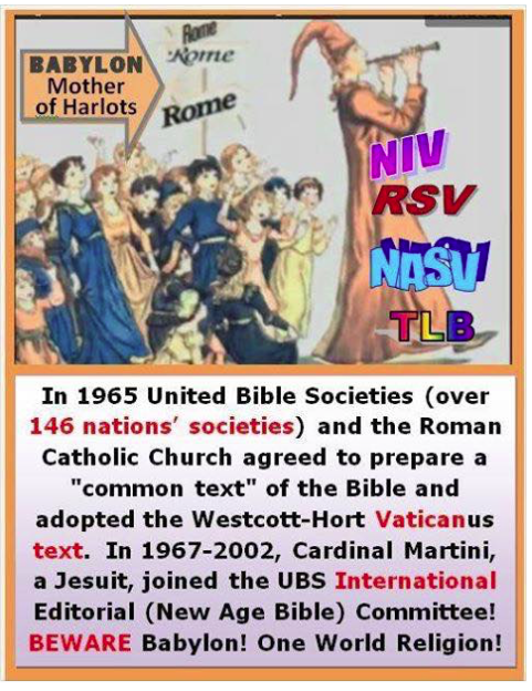 In sharp contrast to the KJB and all Reformation Bibles in multiple languages, modern versions like the ESV, NIV, NASB, NET, the Jehovah Witness New World Translation and the modern Catholic versions like the St. Joseph New American bible 1970 and the New Jerusalem bible 1985 are ALL based on the SAME, ever changing UBS (UNITED Bible Society) Nestle-Aland Critical Greek text which is directly under the Supervision of the Vatican.
