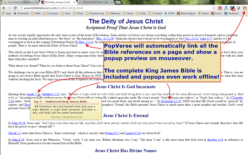 After doing some research we determined a Chrome Browser Extension was the best system to make a local, "stand-alone" reference tagger/viewer from. It also helps that Chrome is now the most popular browser, at around 65% market share. So learning the Chrome APIs and working in our spare time, the Lord allowed PopVerse for Chrome to be developed. There is no other reference tagging tool like it, and here's why.